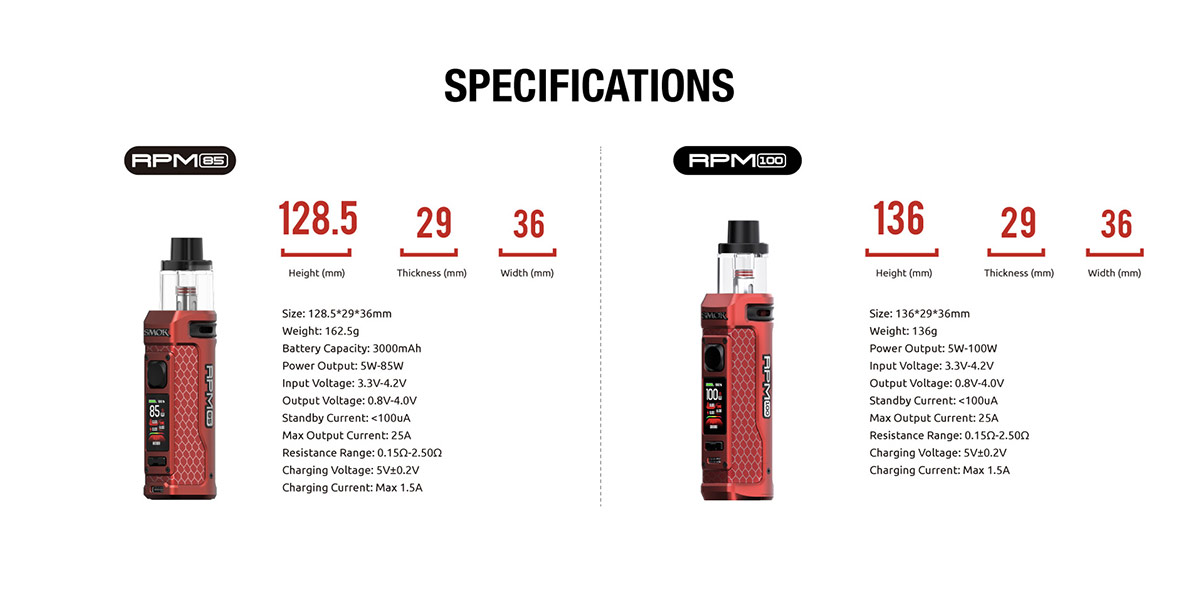 Plus several safety functions and a child-proof lock mechanism on the RPM pod provide peace of mind when vaping. If you love the look of the 100W mod but want something a bit smaller containing an internal 3000mAh battery, the Smok RPM 85 vape kit is also available.